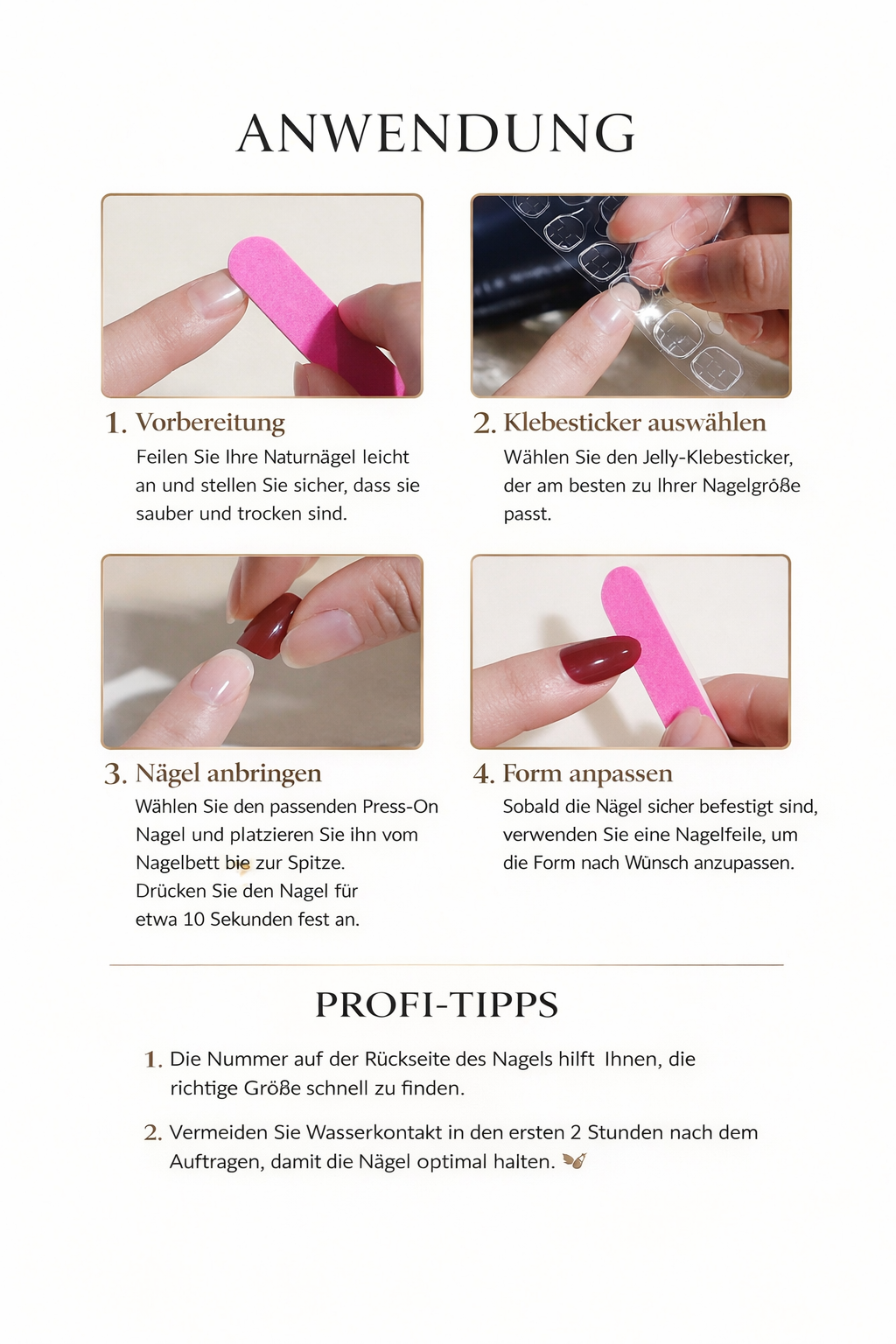 24 Größen für jede Nagelform – hält sicher bis zu 7 Tage ohne Ablösen.